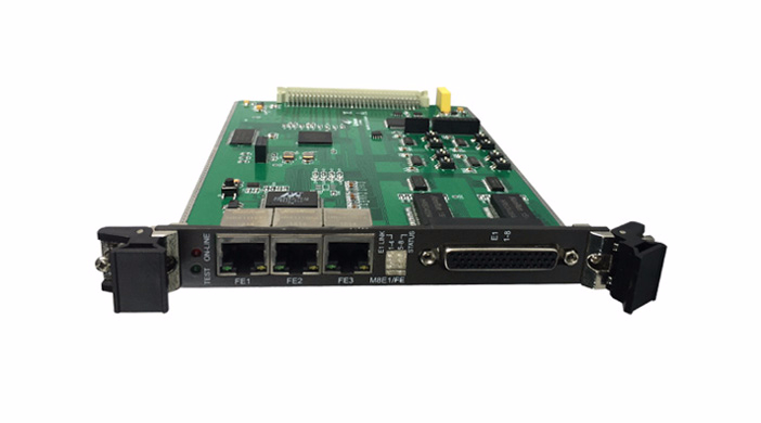 M8E1/FE E1&FE接口板可插裝到ZMUX-4102平臺的任意一個IO業(yè)務(wù)板通用插槽,設(shè)有1個DB44連接頭,提供8路E1接口,可設(shè)為上行鏈路接口或下行業(yè)務(wù)接口使用,完成1~8路E1信號接入,并具備8路E1無阻塞的任意時隙交叉連接功能。